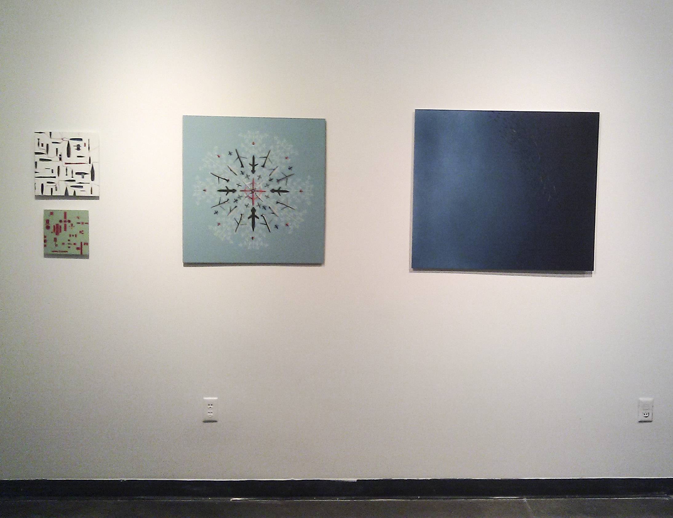 The three artists in this exhibition are all visually distinct but all working on projects that are honed in on the aerospace theme. All three happen to live in the Los Angeles area. Maybe it is the skies of LA being filled with a proliferation of airplanes, ghetto birds (helicopters), and blimps that draw all of their eyes upward. Maybe it has something to do with the fact that the desert is nearby with many airbases, bombing ranges, and even the shuttle landing strip. No matter the reasons, these three artists approach the subject from radically different perspectives but all do it well.