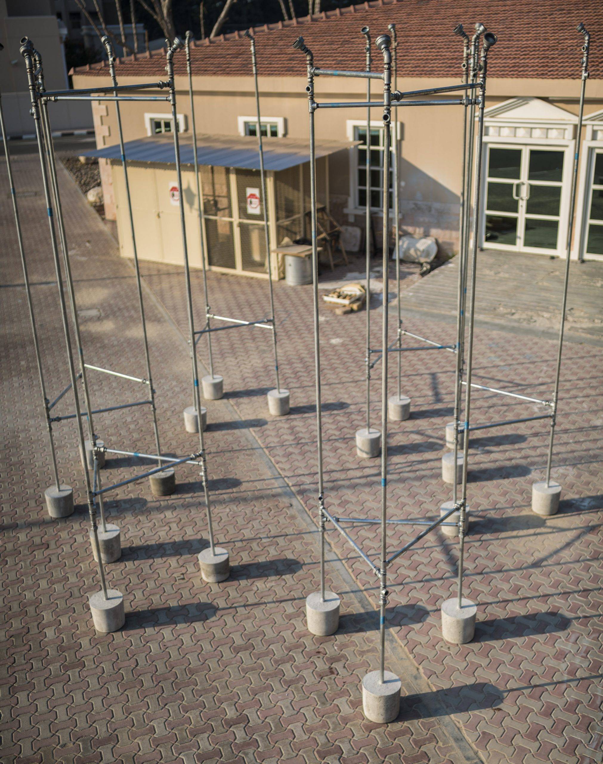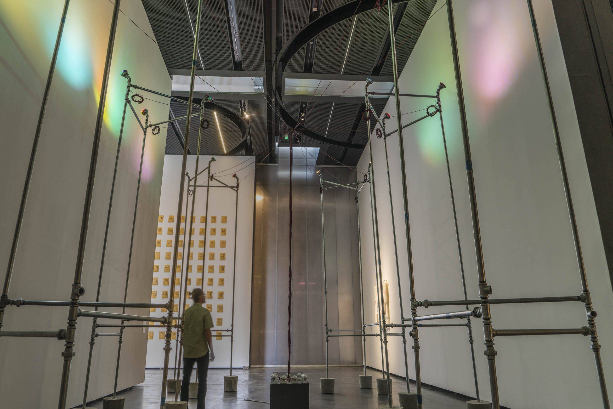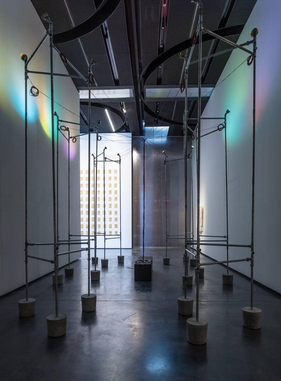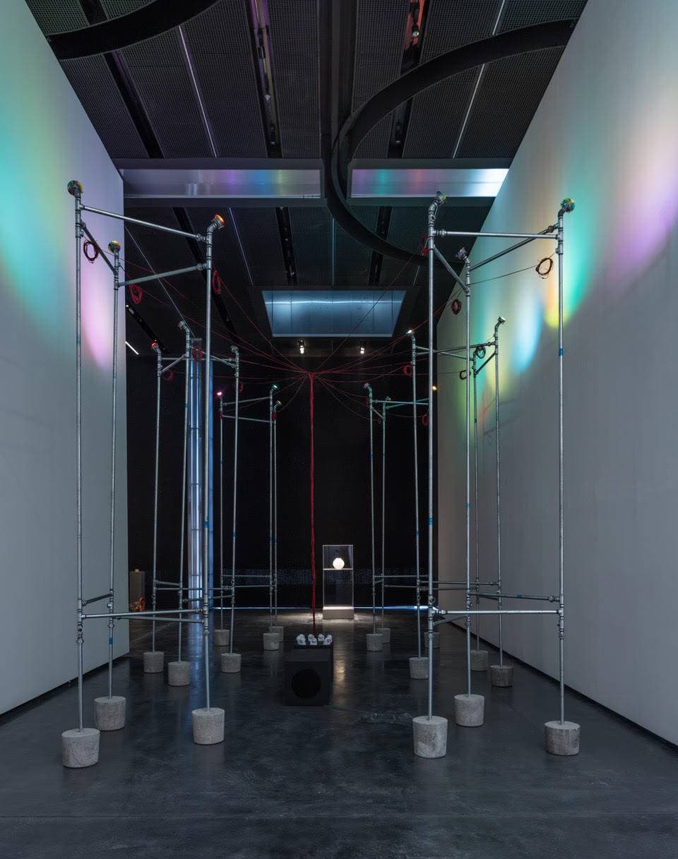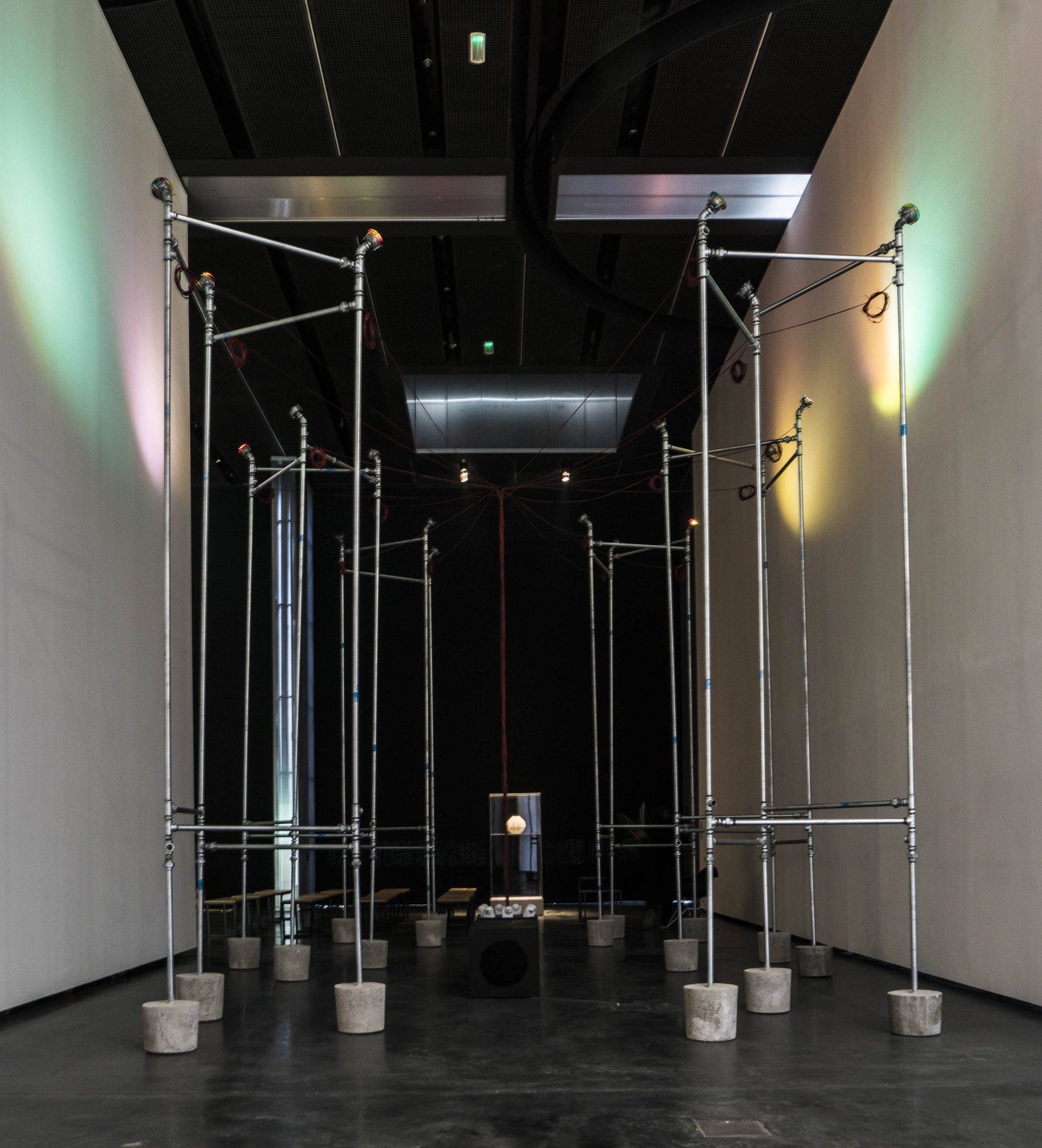 2018, Interactive Installation (steel pipes, concrete, lighting, sensors, infrasound system), 4.8 x 5 x 6 meters (variable)