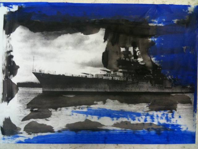 SpaceCamp will be transformed by Frillici into an audio-visual path inspired by that tragic fact. Sounds of lapping waves and the national anthem will fill the gallery; images will hang and spread about, images of the sailors, the artist, the ship, will all compete for your attention; objects and fragments, like relics found at low tide will spread through the small space; drawings and paintings complete this mixed media, site-specific installation that Frillici will create over the week leading up to the opening reception.