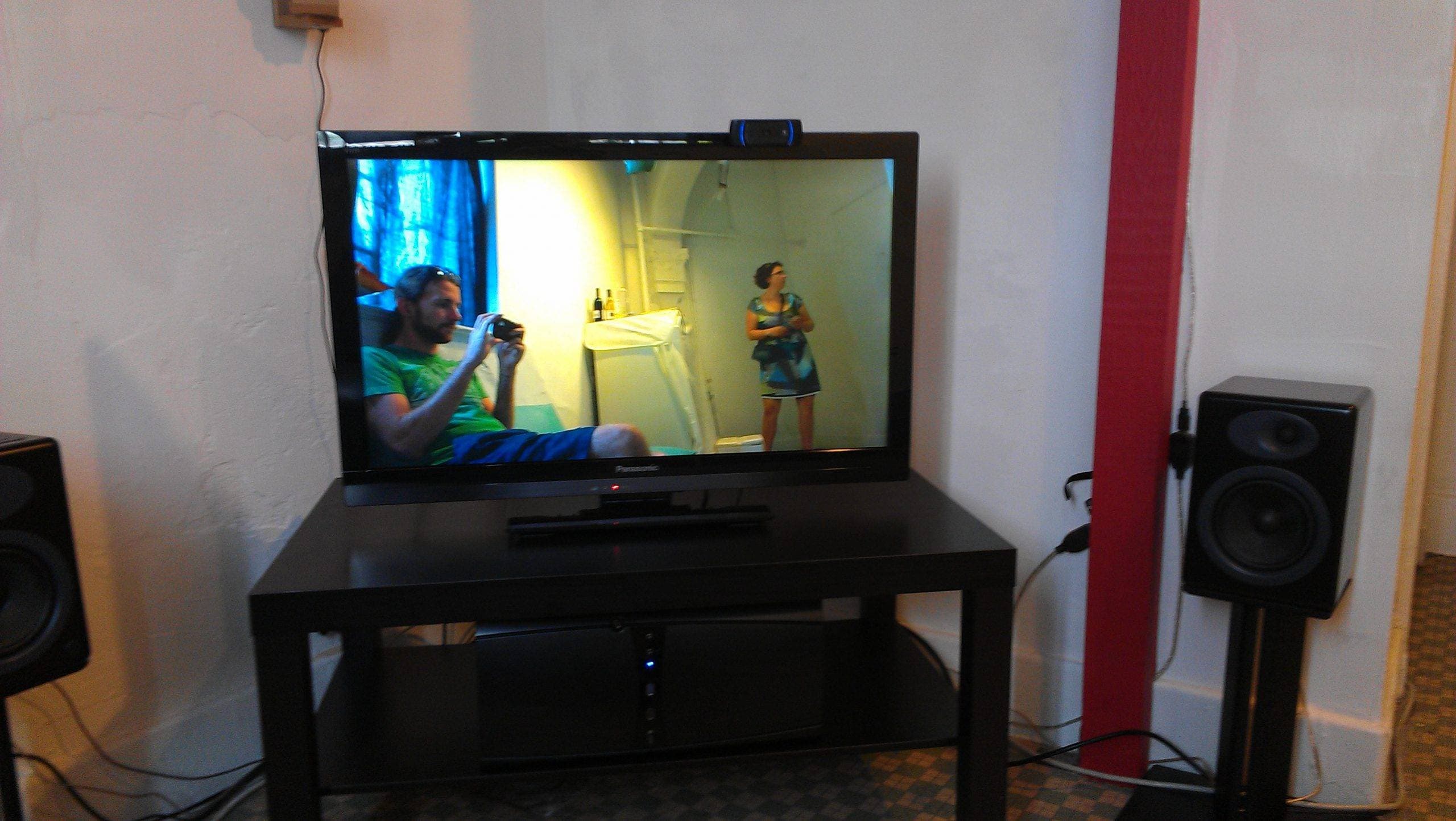This installation at SpaceCamp titled Speed of Reality explored these questions. It presented the viewer with a living room environment where they could sit and watch themselves on the HD television. They saw themselves in the style of reality TV, with constantly changing camera angles that zoom and pan on the subject. The music shifted rapidly, changing the mood. Is “reality” media altering non-mediated reality?